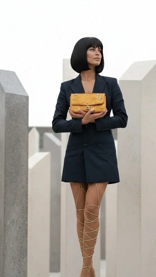 Como accesorio central, Vivianna lleva un bolso de mano rectangular de color dorado. La superficie del bolso, adornada con un material brillante y texturizado, captura la luz. Su color vivo le da a Vivianna un toque de lujo y establece un diálogo de contraste con ocres de sus sandalias romanas.