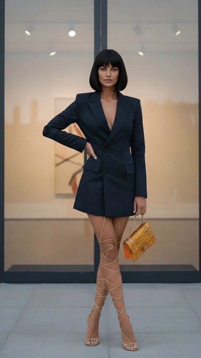 La chaqueta, que funciona como un vestido corto, presenta un corte limpio y unas hombreras marcadas que le dan una silueta poderosa y estructurada. El escote en pico añade un toque de sensualidad, equilibrando la formalidad de la prenda.