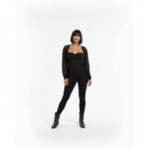 Este mono negro de cuerpo entero es la base arquitectónica del outfit, destacando por su diseño de tirantes múltiples en el escote que añade un toque geométrico y sensual.