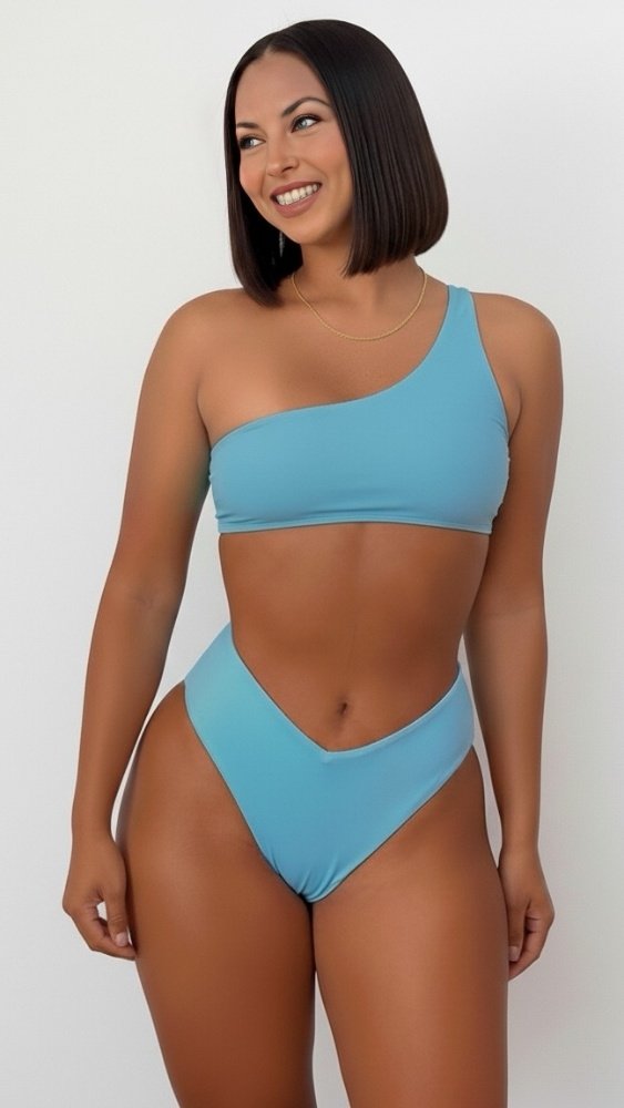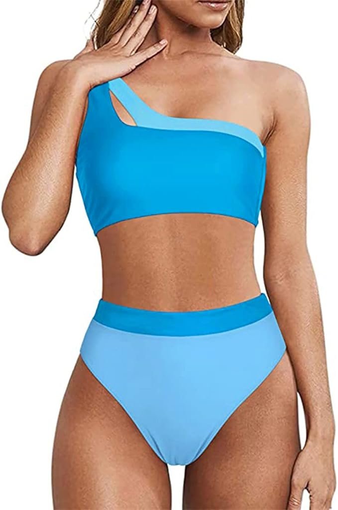 Mira que bikini tan bonito, su diseño único y elegante de un solo hombro en dos tonos de azul, ofrece un look de playa moderno y diferente.