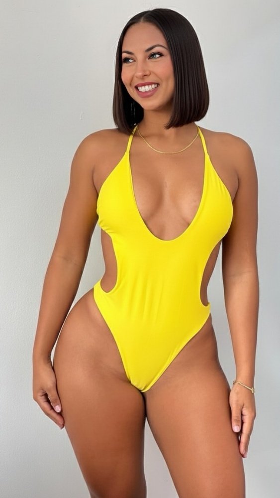 Atrevido bañador de una pieza en un bello color amarillo es moderno para destacar en la playa. Confeccionado en 100% poliéster, su diseño de cintura alta y corte de pierna alto estiliza la figura y realza las caderas.