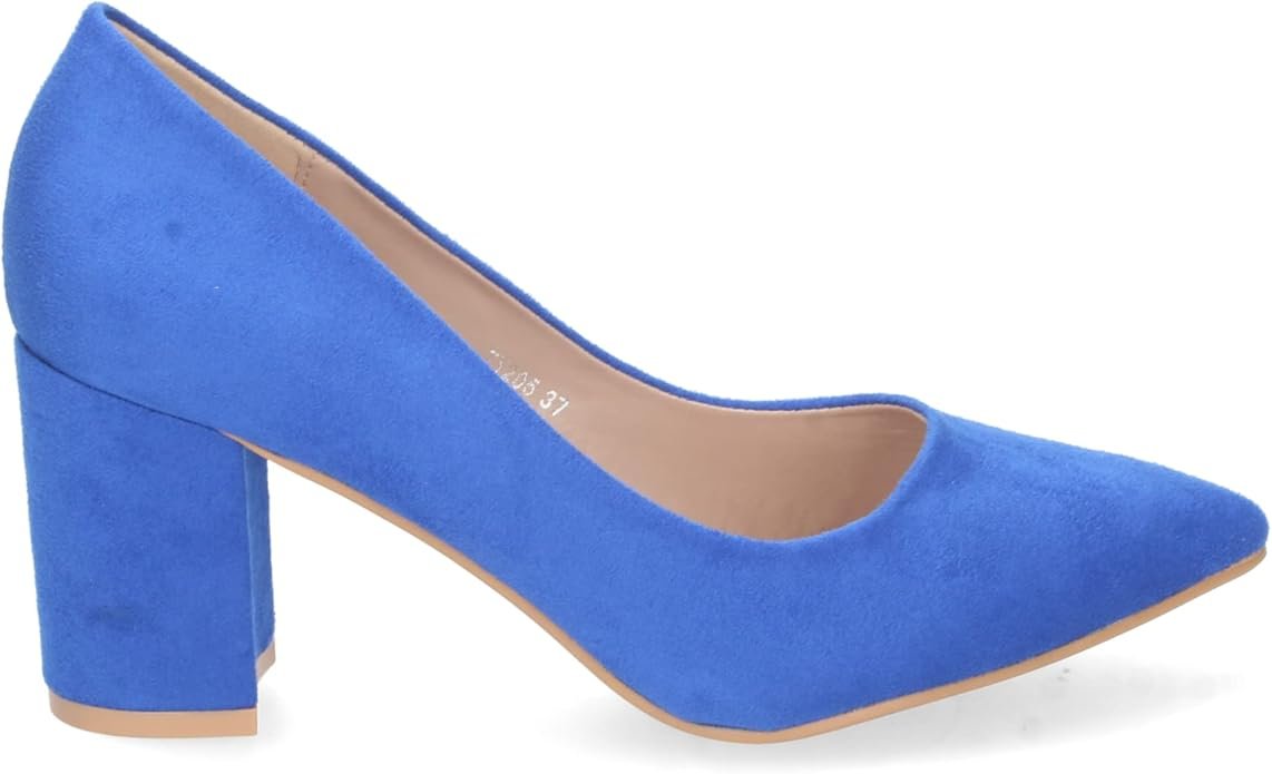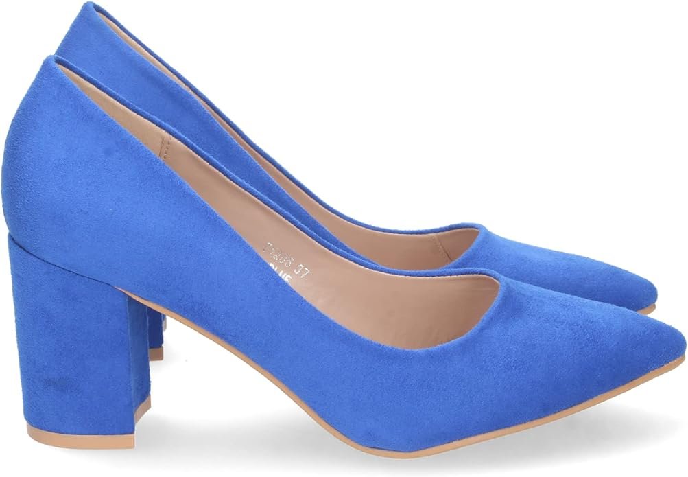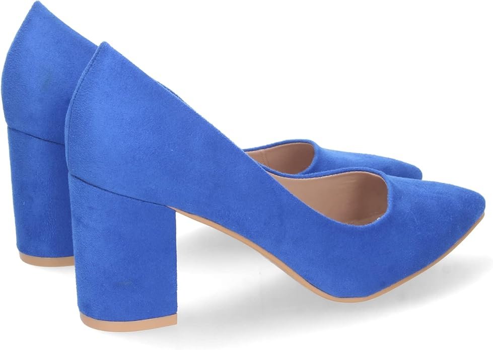 Este calzado de salón destaca por su fabricación integral, es un zapato clásico en ante azul sintético de alta densidad con acabado mate (no brillante). Su diseño ergonómico incorpora una puntera fina estilizada y un tacón ancho tipo bloque que maximiza la superficie de apoyo. La estructura interna cuenta con un forro suave y una plantilla técnica diseñada para amortiguar la presión en el metatarso durante el uso prolongado.