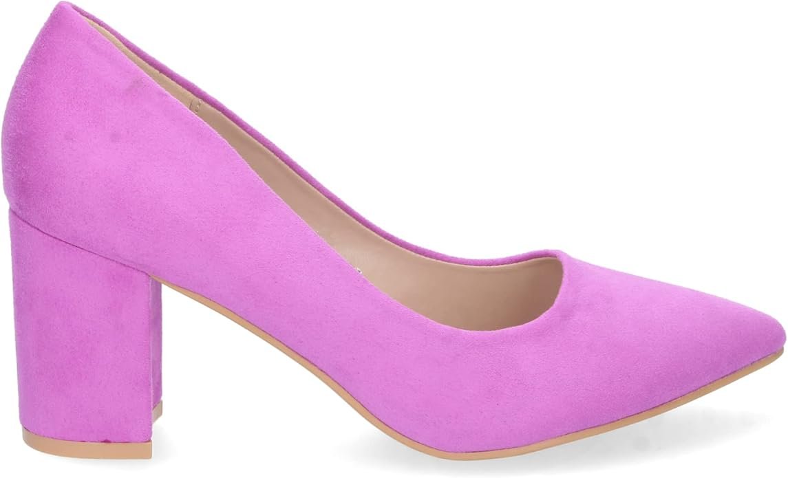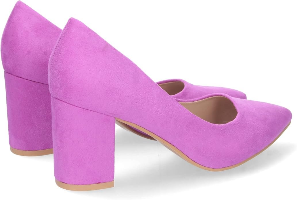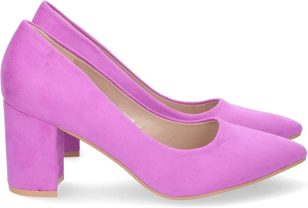 Este calzado de salón destaca por su fabricación integral, es un zapato clásico en ante morado (lila) sintético de alta densidad con acabado mate (no brillante). Su diseño ergonómico incorpora una puntera fina estilizada y un tacón ancho tipo bloque que maximiza la superficie de apoyo. La estructura interna cuenta con un forro suave y una plantilla técnica diseñada para amortiguar la presión en el metatarso durante el uso prolongado.