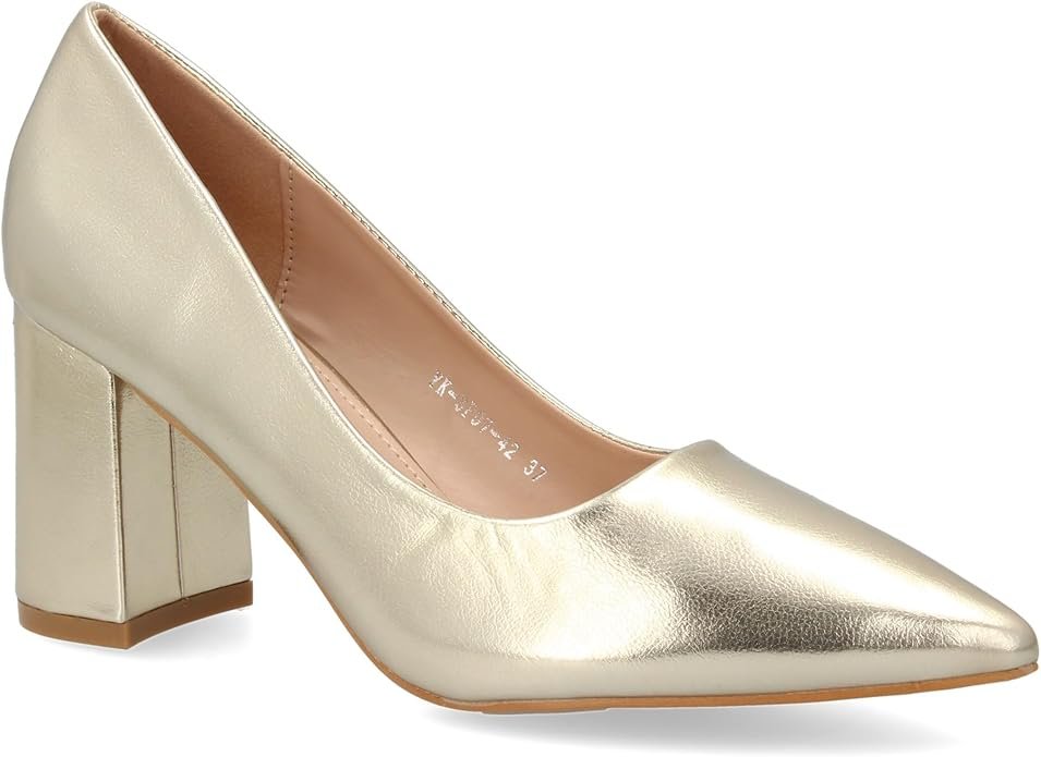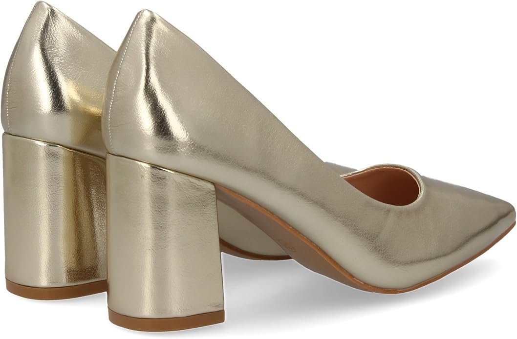 Este calzado de salón destaca por su fabricación integral, es un zapato clásico dorado sintético de alta densidad con acabado brillante. Su diseño ergonómico incorpora una puntera fina estilizada y un tacón ancho tipo bloque que maximiza la superficie de apoyo. La estructura interna cuenta con un forro suave y una plantilla técnica diseñada para amortiguar la presión en el metatarso durante el uso prolongado.