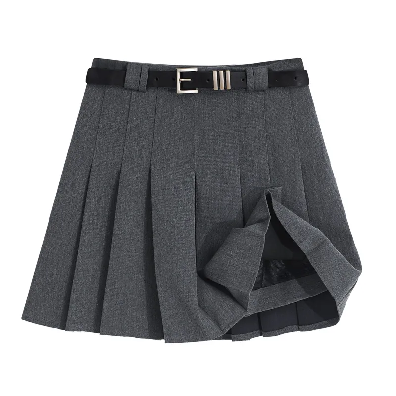 Esta minifalda en tono gris medio presenta un diseño de tablas anchos que me recuerdan la estética colegial, pero con un giro moderno y urbano.