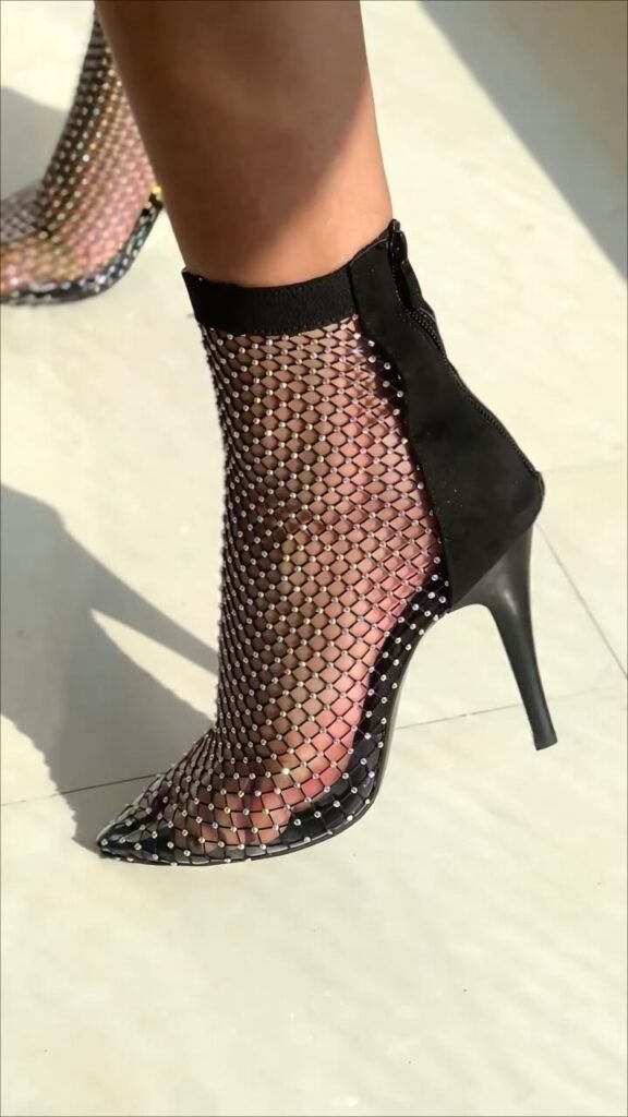 Su diseño de calcetín se ajusta perfectamente al tobillo simulando ser un botín (¿lo es…?), creando una línea continua que estiliza la pierna, mientras que la transparencia de la malla aporta un toque sensual y vanguardista.
