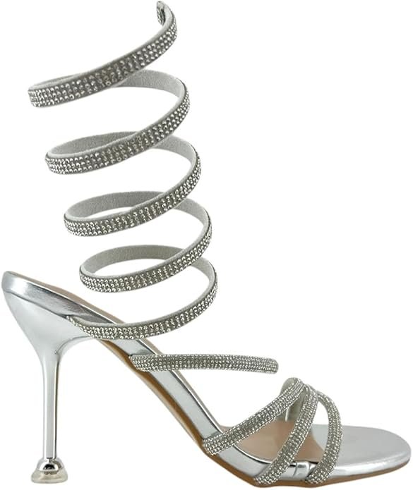 El material reflectante actúa casi como un neutro dentro de la paleta fría permitiendo que los zapatos se integren sin competir excesivamente con el azul del vestido. El tacón presenta una arquitectura sólida que eleva la postura sin añadir peso visual excesivo manteniendo la ligereza general del atuendo.